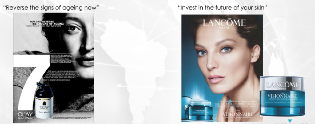 不同程度的购物行为,这些也都是文化差异的表现。比如中国人更偏向短期取向,因此,中国护肤品Olay的广告主打7天见效,注重现在去除岁月的痕迹,这就是短期效益的追求,而法国人则追求长期取向,因此,兰蔻的广告体现了对未来的肌肤投资,也就是所谓的长期效益。
