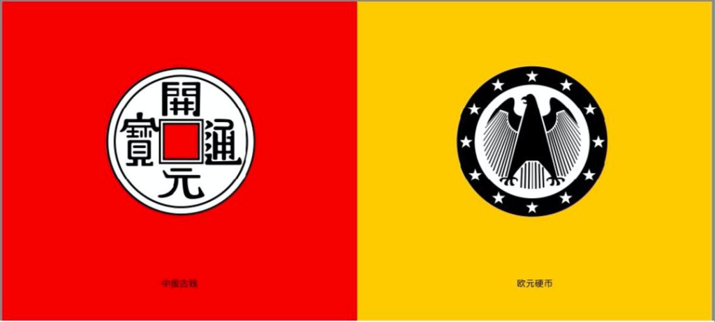 左边的图案代表中国的古钱,右边代表德国的硬币,德国硬币中的联邦鹰是1990年德统一后的新国徽。
