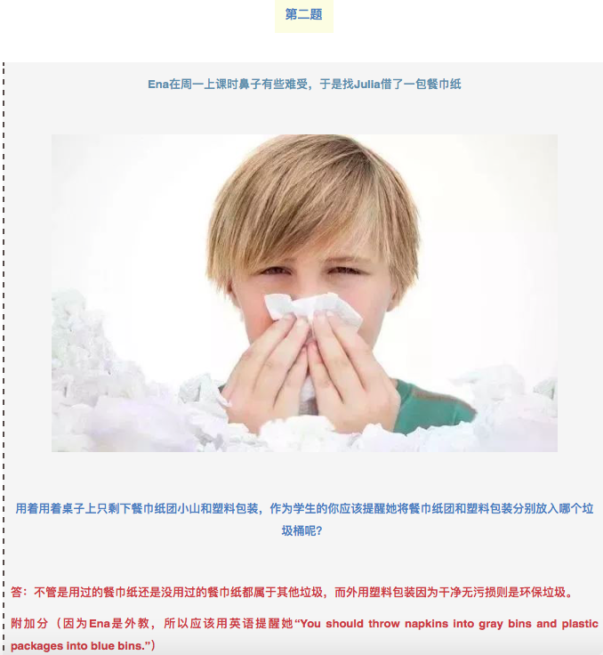 学校的垃圾筒从原来的两个拓展成现在的三个:可回收垃圾和不可回收垃圾 → 可回收垃圾,其他垃圾和有害垃圾。虽然这三种垃圾并不难分类,但也颇需要下一番功夫,不如一起来看看下面几道题,测试一下自垃圾分类能力吧!