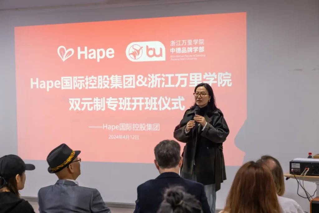 中德品牌学部主任、中德设计与传播学院院长张宜平发表致辞,中德品牌学部引进德国“双元制(Dual System)”办学理念、模式和经验,与Hape集团合作推行“双元制”试点项目,旨在让学生在校企双环境中获得全方位的培养,为学生顺利融入职场,适应国际化企业氛围,增强跨文化就业竞争力奠定基础。他对Hape集团表示感谢,并提醒“双元制”专班的同学们要把握机会,锻炼提升自我。