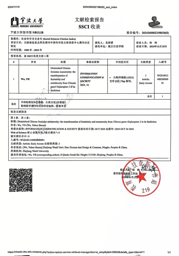 近期,中徳品牌学部Brand Communication专业教师吴雨桦的论文《Diminished Chinese Feminine Monstrosity: the transformation of femininity and monstrosity from Chinese game Gujianqitan 3 to its fanfiction》在SSCI社会科学引文索引(中科院一区)Top期刊——《Information, Communication & Society》上顺利发表。