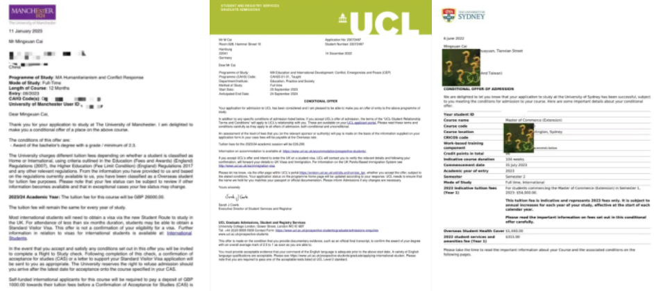 临近毕业的蔡明轩,已经收到了来自伦敦大学学院(University College London)、曼彻斯特大学(The University of Manchester)、悉尼大学(University of Sydney)这三所QS世界排名前50的高等学府的研究生OFFER。