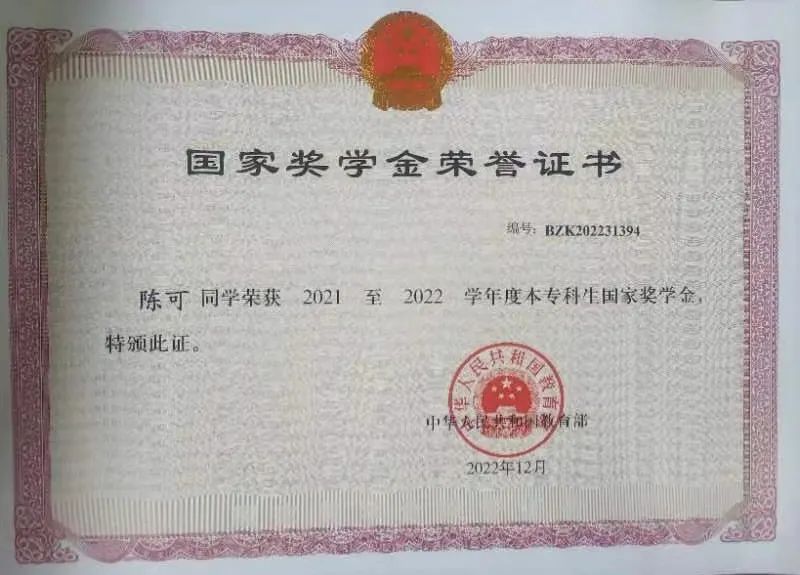 他是中德学院2021-2022学年国家奖学金的获得者;