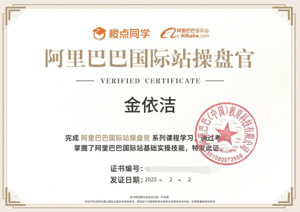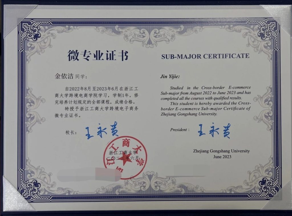 金依洁获得的跨境电商微专业证书