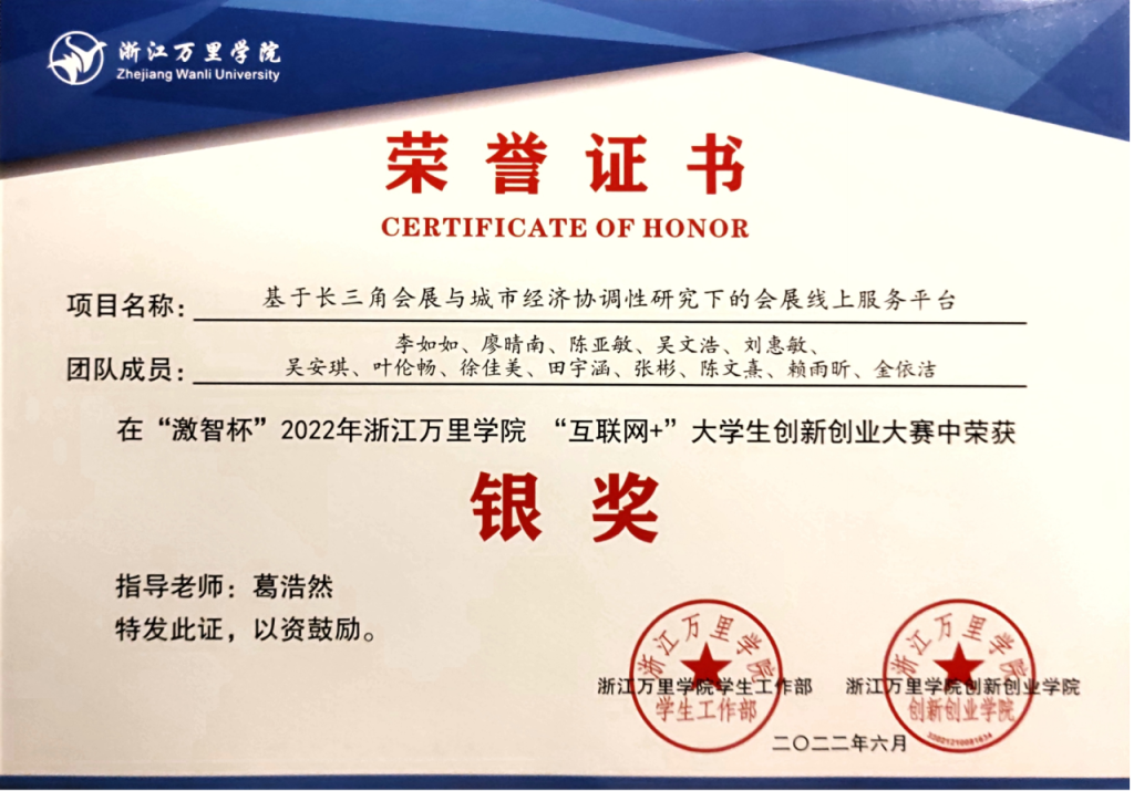 金依洁深知将理论付诸实践的重要性,课余她会参加大学生英语竞赛等各种赛事,也会与其他同学组成跨专业小组参加创新创业、互联网+等比赛。到目前为止,她与不同的团队成员一起,获得了浙江省第十一届会展策划创意大赛省赛一等奖、第十二届全国大学生电子商务“创新、创意及创业”挑战赛跨境电商实战赛·独立站理论赛(校级)特等奖等多项荣誉。