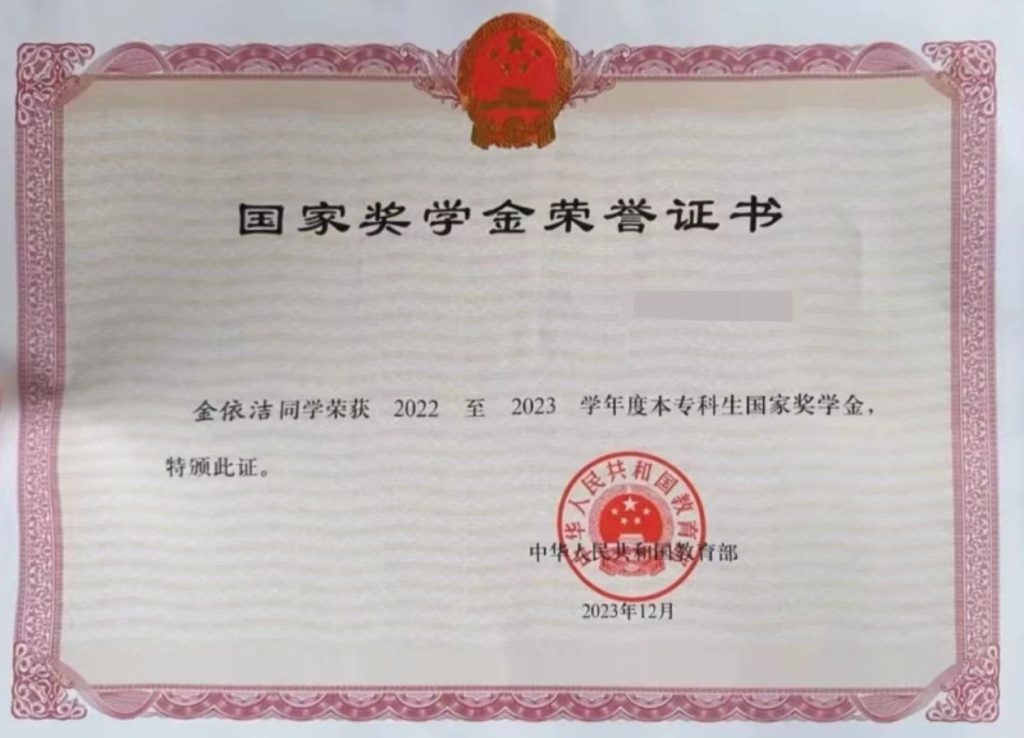 经过长期的不懈努力与深入思考,她连续几年成绩位居专业第一,多次获得校级一等奖学金、省政府奖学金,在2022-2023学年,更是获得了国家奖学金。