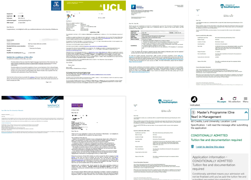 此外,金依洁凭借一以贯之的努力和丰富出色的实习、大赛和活动经历,斩获了QS世界大学排名前100的伦敦大学学院(University College London,排名第9位)、 墨尔本大学(The University of Melbourne,排名第14位)、曼彻斯特大学(The University of Manchester,排名第32位)、布里斯托大学(University of Bristol,排名第55位)、华威大学(The University of Warwick,排名第67位)、南安普顿大学 (The University of Southampton,排名第81位)、隆德大学 (Lund University,排名第85位),以及宁波诺丁汉大学的研究生offer。