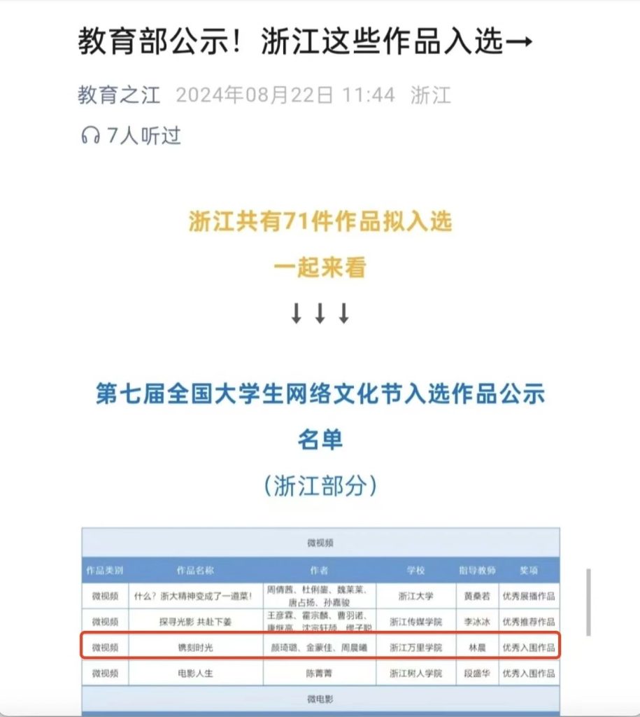 第七届“全国大学生网络文化节”和“全国高校网络教育优秀作品推选展示活动”由中央网信办网络社会工作局、教育部思想政治工作司主办,围绕“争做校园好网民,汇聚网络正能量,挺膺担当建新功”的主题展开。此次活动设立了优秀推广作品奖、优秀展播作品奖、优秀推荐作品奖及优秀入围作品奖等多个奖项,旨在丰富校园网络空间生态,全面提升学生的网络素养,推动网络文明建设。自2023年9月活动启动以来,共收到50771件作品,其中浙江省共有71件作品成功入选。