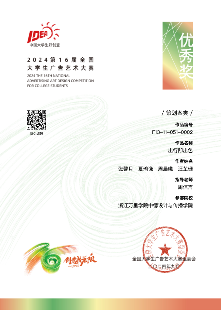 备战大广赛之初,小组就立志获奖,虽然我是首次参与策划案,心中有些忐忑,但依然秉持踏实作风,在小组的合作中稳步磨合。我主要负责的是创意策划与视觉设计,“出行即出色”主题确定后,我将灵感注入活动。后期创意落地,我完成海报与打卡装置样机设计,还邀请专业同学润色策划案。我认为成功关键在“人和”,团队成员各有所长且善于交流融合,周信言老师的无私相助尤为重要,我们共同助力策划案成熟完善,付出最终获得了回报。