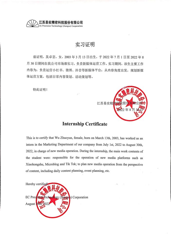 吴卓芸的实习轨迹如同打怪升级,七段横跨数据分析市场研究新媒体运营品牌策划的实习经历,勾勒出吴卓芸“学以致用”的实战图谱,同时印证了中德品牌学部“校企协同、双元育人”的成效——让课堂知识在真实商业场景中生根发芽。