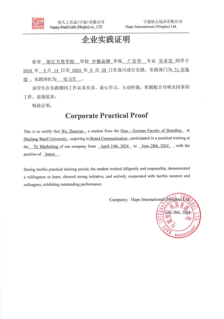 作为中德品牌学部“双元制”校企合作项目的受益者,吴卓芸通过学部搭建的实践桥梁,进入德资的玩具龙头企业–Hape怡人集团担任市场部实习生。她深度参与品牌全链路推广,从策划线上线下活动到项目落地执行,从竞品数据挖掘到消费者需求洞察,将课堂所学的专业知识转化为商业价值。这段经历不仅让她掌握“从策略到执行”的闭环能力,也让她在真实产业场景中,成长为懂理论、擅实战的品牌新生代。