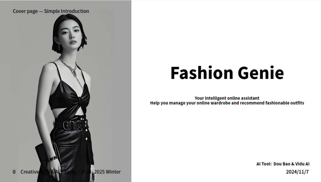 “Fashion Genie”时尚精灵是一个线上App应用界面。通过初始登录页面、主页面以及数据调节页面展示了这款App的主要功能:自主扫描创建虚拟模特、扫描衣物入库、每日穿搭推荐以及时尚社区交流。并且最后通过一段AI制作的动画来体现了线上衣橱与现实时尚生活的紧密结合。