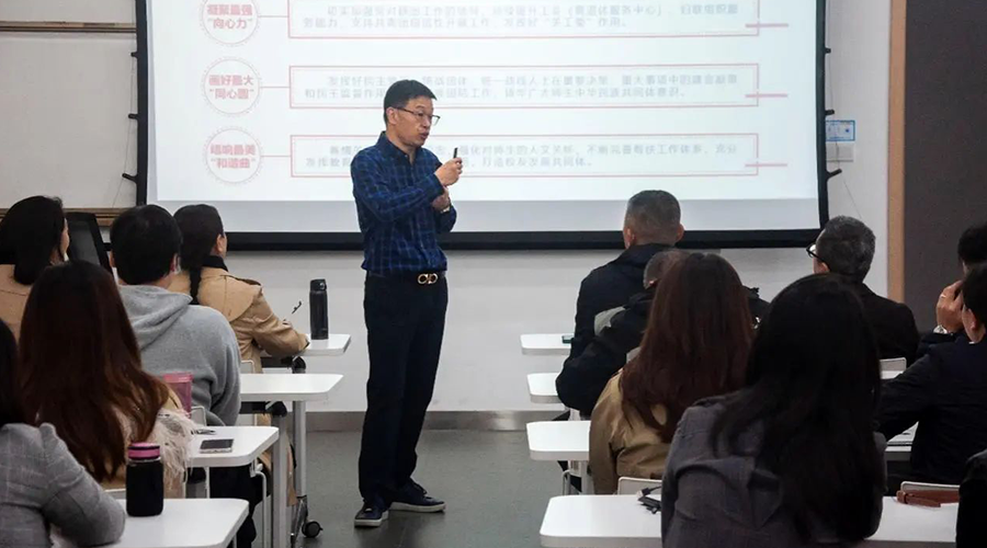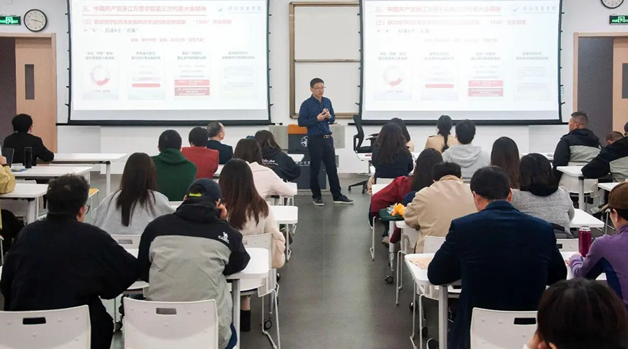 在宣讲过程中,马校长还特别强调了参会的各个学院部门要提高站位,勇挑重担。中德品牌学部作为学校国际化建设的重要窗口,应充分发挥中外合作办学的优势,整合国际资源,加强品牌科学建设,在中外联合实验室建设及国家级课题申报等方面取得更多突破;马院的学科建设要为全校的思政教育赋能,浙江万里学院创始者徐亚芬、应雄等人的初创精神应融入到日常课堂教学之中,引导学生们传承并发扬万里精神;文体部承担了美育体育工作的重担,夯实体育教育,做精美育品牌是文体人的目标;国际学院作为留学生管理的职能部门要为学校的国际化建设提质出力谋划。