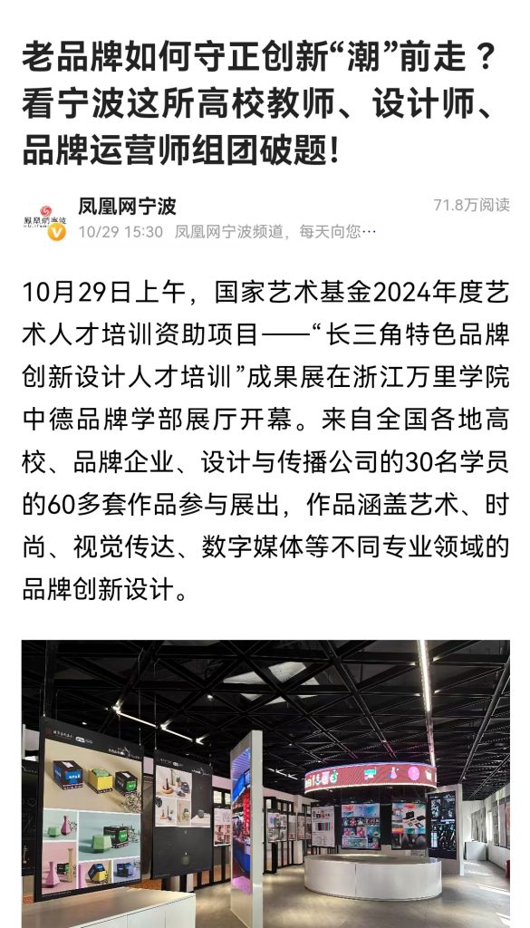 老品牌如何守正创新“潮”前走 ? 看宁波这所高校教师、设计师、品牌运营师组团破题! 首页 最新资讯 媒体报道 / 2024年10月29日 https://ishare.ifeng.com/c/s/v0063Hk-_IbxWCWHhXlQ3N8yc3Aaw33ZX8x–QHYS3FNdscJxHqC035ikp3Uery7XTqvrO?spss=np&channelId=&aman=7x4bbg836rf6a1bcaL964&gud=37n392C158