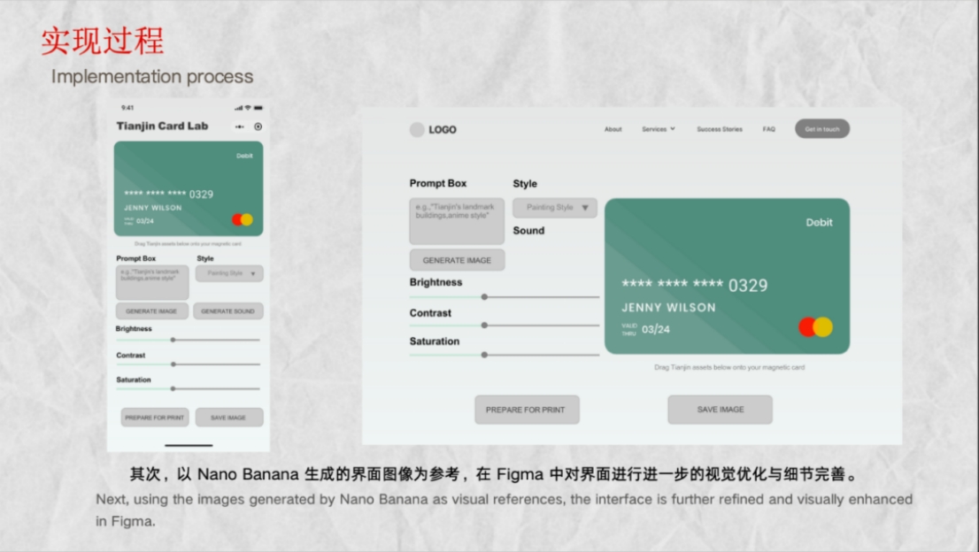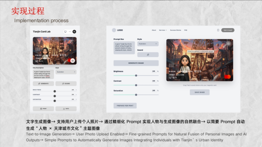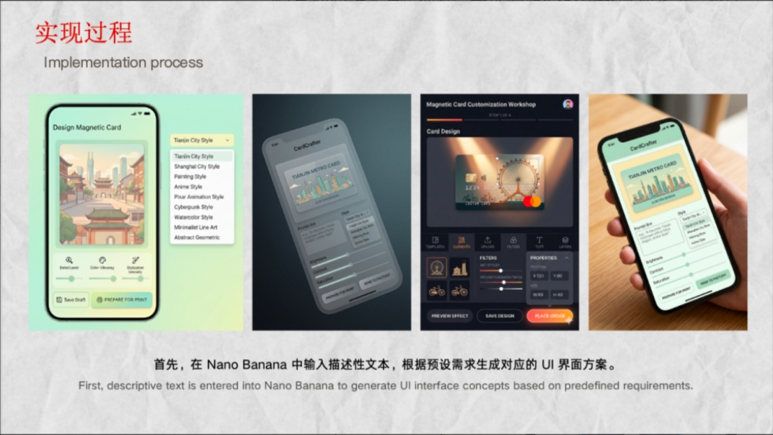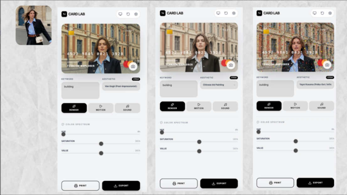 本项目以“生成式AI+应用开发”为核心架构,以GenMini为主要视觉生成引擎。前期,它快速产出多样化的磁卡风格与界面方案,极大降低了视觉探索成本,推动设计重心转向“选择与判断”;在交互中,系统支持从文字生成图像到融合用户上传照片,并能通过简练关键词(如“building”)自动生成具有天津文化特色的图像,确保了输出的文化一致性;后续计划将生成逻辑本地化、结构化,并融入视频与声音模块,以构建一个多模态的记忆生成系统。