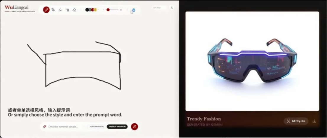 店内AI实时绘画交互系统:顾客可以在选择笔刷和颜色进行绘画,输入描述性文字或选择风格标签,右侧屏幕会实时生成对应的眼镜模型。点击“AR试戴”按钮,即可将自己的设计作品通过AR技术试戴在脸上。