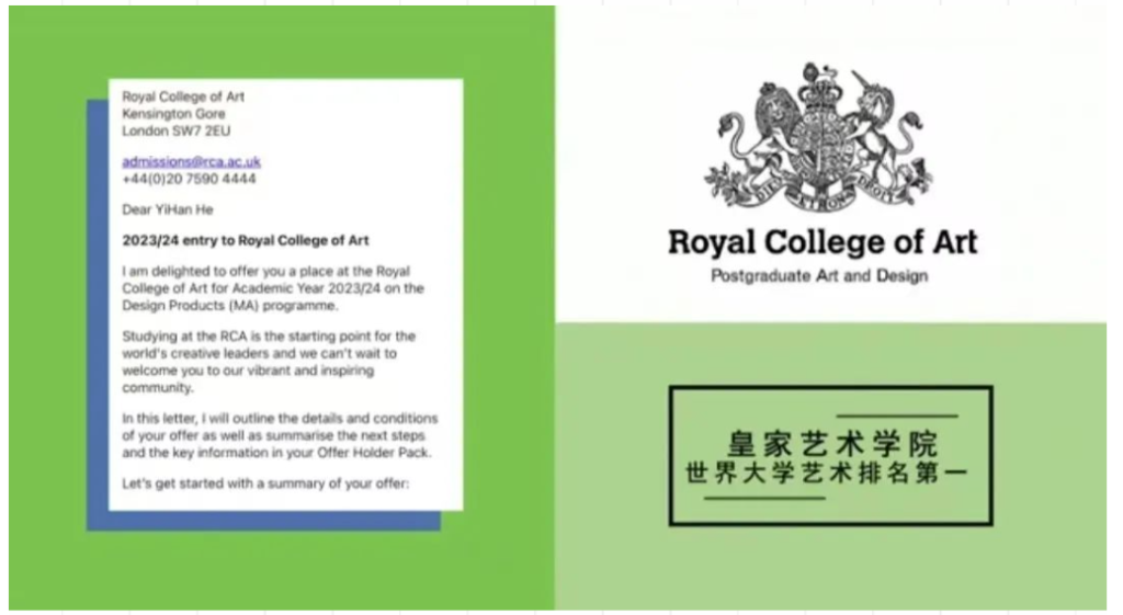 Based on his own experience, He Yihan gave advice to students who aim to go abroad for graduate school: "StudentsHave goals and planning. Setting a goal is to give yourself added motivation, planning is to help you reach that goal. Never set your sights low - I don't hang on to a top school, but I approach it step by step with my actions.See the distance and do not fear the competition--Our competitors are strong, they are "double first-class" universities, major art schools, and overseas undergraduate students. We should help each other, encourage each other, and compete in a healthy way, so that we can accomplish our dreams and enter the college of our choice. "