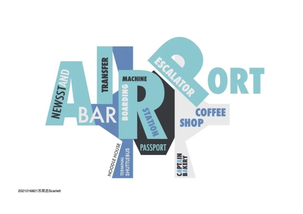 Works: "The building I chose was Chengdu Airport. I started by simplifying the complex appearance of the airport into geometric shapes made up of simple lines, and then chose words related to the airport building to fill in the typography. The airport feels modern, scientific and efficient, so I chose Futura, a sans-serif typeface, to show this character. In the typography, I enlarged the word "Airport" as much as possible, so that people could see the theme at first glance and it would have a certain visual impact. In terms of color selection, I used a large area of blue and white related to the sky to make the colors relate to the theme, and added black to balance the colors throughout the piece."
