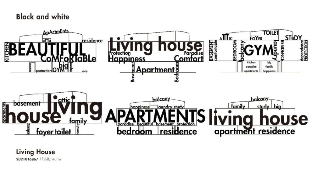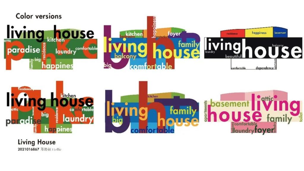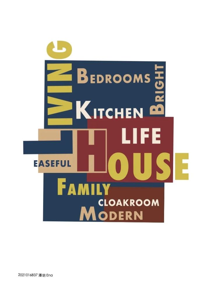 Works: "I chose a modern house as my Living House, so I chose Futura, a sans serif font. I chose a retro color scheme for the color scheme. The lighter reds and blues are paired with the brighter yellows and flesh tones, making a strong contrast between the dark and light colors and making the piece more readable. In the arrangement of the text, I set LIVING HOUSE to the largest font size and placed it in the middle of the picture to highlight the theme of the work, and set the main color of this text to yellow, where the colors of the letters L and H are dark blue and dark red respectively to enhance the sense of design. I also chose words like FAMILY, LIFE, etc. to correspond to the theme of the work Living House. In the placement of the typeface, I chose both vertical and horizontal to symbolize the calmness and stability of people's daily life. The overall design of this work expresses my idea of the interior decoration of my future house, and the Living House I aspire to is such an American vintage style."