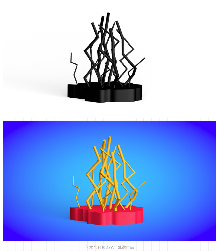 Work description:Fire gives me a feeling of vitality, of being alive, so I gave it a rippled form with vertical lines to signify extension and continuity. The prismatic block on the right represents the heart of the flame, forming an overall triangular structure, which, together with the two triangular cones on the left, has an invisible feeling of growth. The two triangular flames on the outside simulate the sense of leaping of real flames.