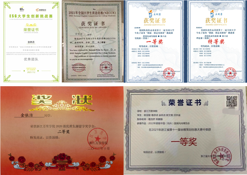 Jin Yijie knows the importance of putting theory into practice. After class, she takes part in various events such as the College Students' English Competition, and also forms inter-disciplinary teams with other students to take part in competitions such as Innovation and Entrepreneurship and Internet+. So far, she, together with different team members, has gainedThe first prize of the 11th Zhejiang Provincial Exhibition Planning and Creativity Competition, the special prize of the 12th National College Students' E-commerce Innovation, Creativity and Entrepreneurship Challenge Cross-border E-commerce Competition - Theory Competition of the Independent Station (school level), and many other honors..