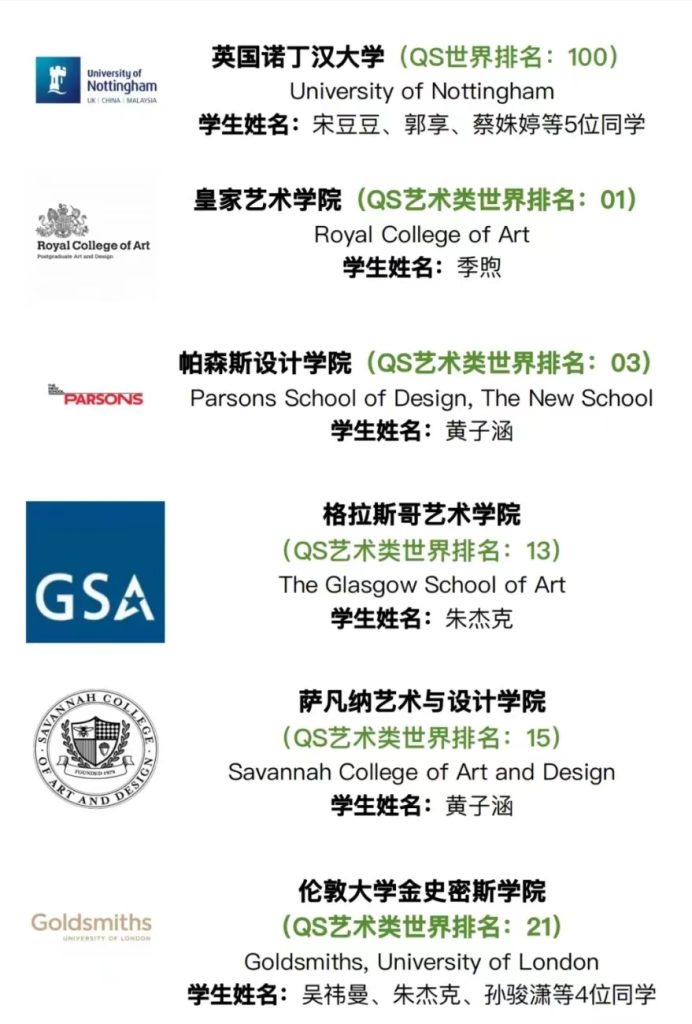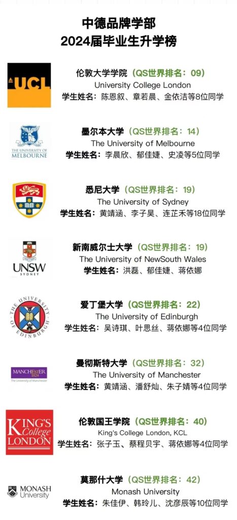 Numerous Sino-German students have been admitted to master's degrees at top global universities ranked in the top 100 of the QS World University Rankings, includingRoyal College of Art(QS World University Rankings #1 in Art and Design),United States of AmericaParsons School of Design(QS World University Rankings #3 in Art & Design),University College London, UK(QS World University Rankings #9),University of Melbourne, Australia(QS World University Ranking 14),University of Sydney, Australia(QS World University Rankings 19th),University of New South Wales, Australia(QS World University Ranking #19) and other world-renowned universities.