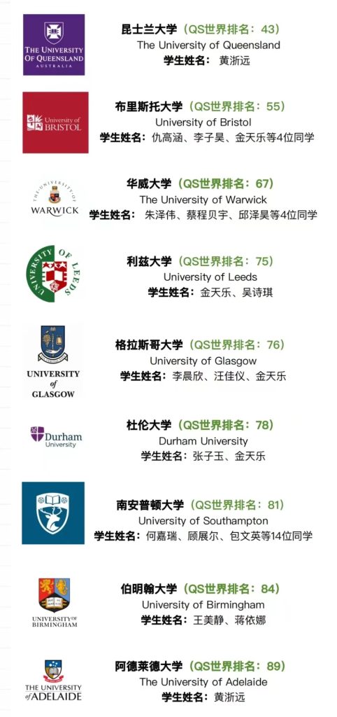 Postgraduate offers from University College London, University of Melbourne, University of Manchester, University of Bristol, University of Warwick, University of Southampton, Lund University, and University of Nottingham Ningbo.
