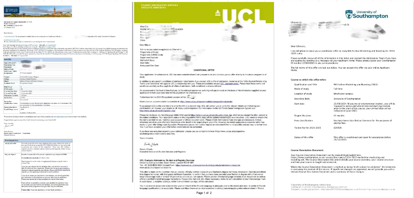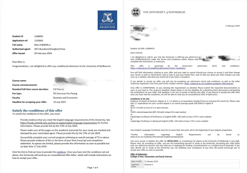 To date, Li Chenxin has received awards from University College London, The University of Melbourne, The University of Edinburgh, The University of Glasgow, The University of Southampton, The University of London, The University of London, The University of Melbourne, The University of Edinburgh, The University of Edinburgh, The University of Glasgow, The University of Glasgow, The University of Glasgow, The University of Southampton and many others. University of Edinburgh, University of Glasgow, The University of Southampton, etc.Offers from 5 world-renowned schools.