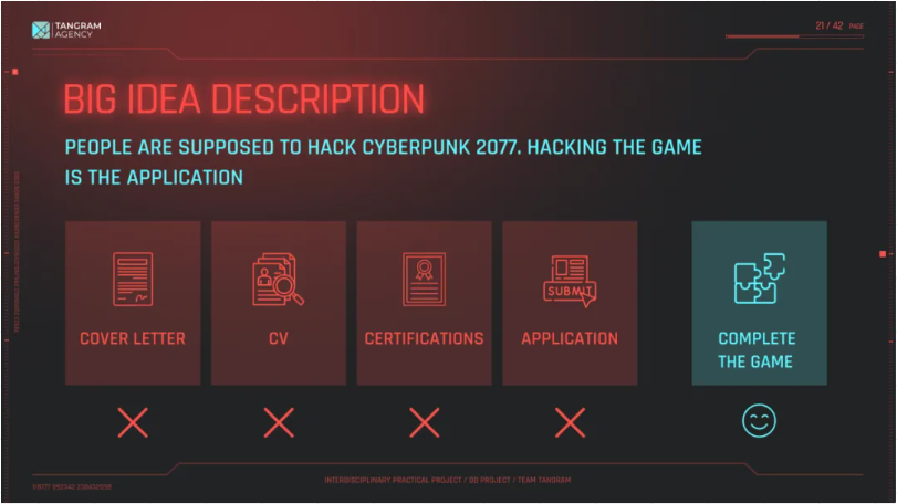 "In the Interdisciplinary Practicum course project, I teamed up with students from other majors for theDeutsche Bahn offers recruitment campaigns in the field of employer branding.. Based on the weak sensitivity to advertising of the young IT community in the age of Z, a new employer branding campaign and recruitment advertising program was designed for DB in the game content of Cyberpunk 2077, utilizing the game DLC format.