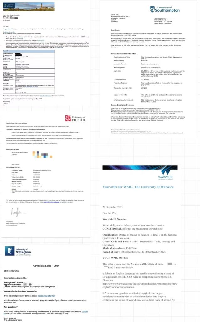 As a 2024 graduate of the Exhibition Economics and Management (Sino-German 2+2) program, Zhu Zewei has received a letter fromThe University of Bristol, The University of Warwick, The University of Glasgow, The University of Southampton, The University of Nottingham, The University of Nottingham and The University of London. Nottingham.and other world-famous schools, as well as obtaining theUniversity of Southampton Pound2000of scholarships.
