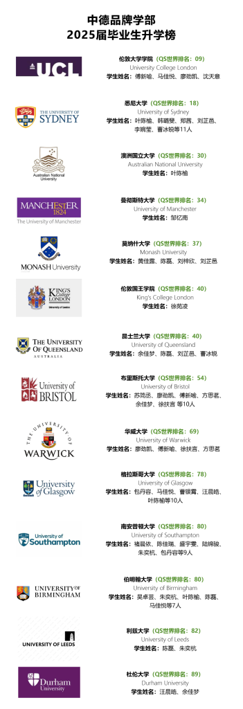 In the tide of globalized education, the 2025 graduates of Sino-German Brand School have already achieved remarkable milestones in the field of international education with outstanding academic performance and unremitting efforts. According to the latest statistics, the school has already38 studentsSuccessful promotion to graduate school.Received a total of 91 acceptance letters (Offers) from prestigious schools.