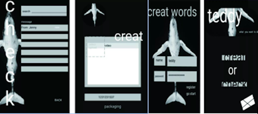 "The design is an app for message interaction, with a function between messaging and WeChat, for delivering more formal invitations. So a black and white tone was used, with the whale symbolizing the delivery of important information in the online world. The semi-displayed white font and simple page hopefully will attract users to join and improve the quality of use."