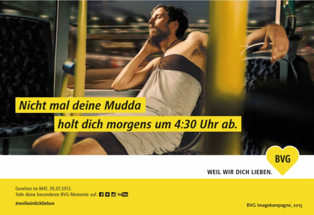 Berliner Verkehrsbetriebe is Berlin's bus company, which operates subways, trams and buses in and around the city. In 2015, Berliner Verkehrsbetriebe launched a campaign with the theme "Because we love you". The main audience was all Berliners. The visual presentation is a recreation of Berlin fever. The presentation is rough, straightforward and confident.