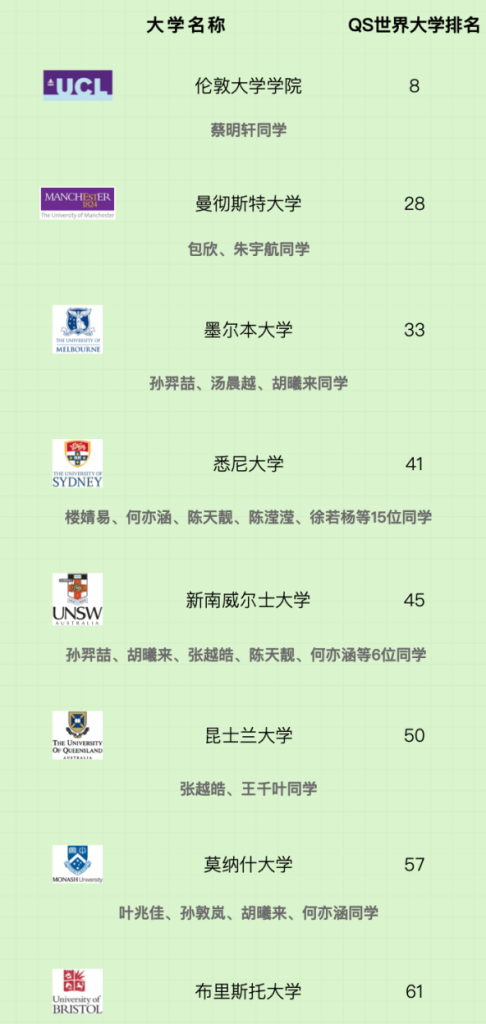 Up to now, among the successful Sino-German students in international studies80.4% of studentsReceive the QS World University Rankings 2022-2023Top 100of the world's top master's schools, includingUniversity College London, UK(QS Rank 8), theUniversity of Manchester, UK(QS ranking 28), theUniversity of Melbourne, Australia(QS ranking 33) and other world-renowned universities, over97%of students ranked by QS WorldTop 200of college admissions.