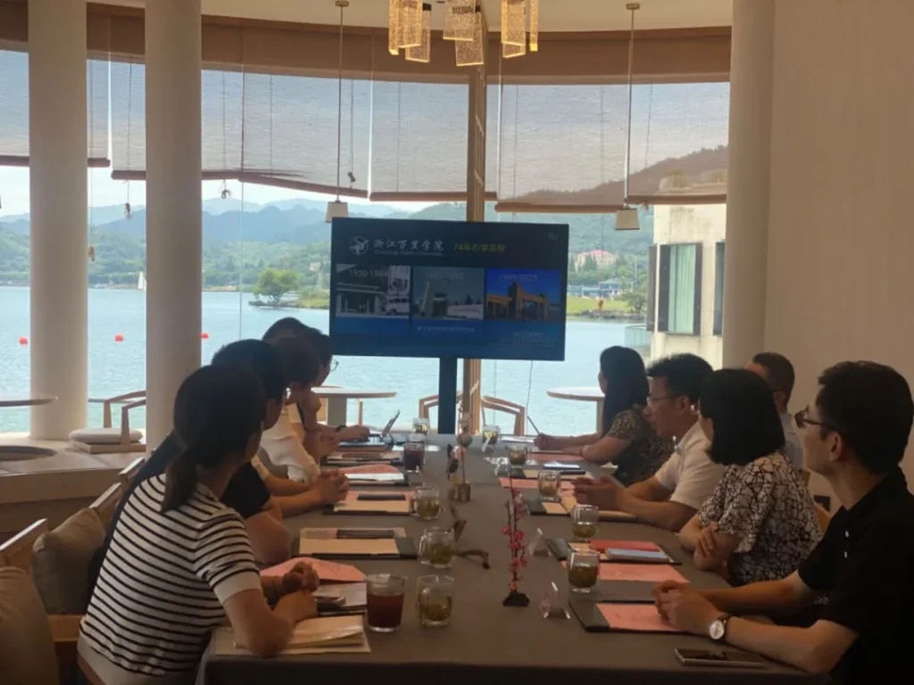 In Dongqian Lake Culture and Tourism Group, Yang Yu, secretary of the Party committee and chairman of the group, and other enterprise leaders warmly received Secretary Wang and his entourage. At the symposium, the relevant person in charge of Dongqianhu Culture and Tourism Group gave a detailed introduction to the business layout and characteristic advantages of the enterprise. Secretary Wang Weizhong also briefly introduced the development history of Zhejiang Wanli University and the current professional construction and talent cultivation of the school to the enterprise, and Zhang Yiping, director of Sino-German Branding Department, highlighted the professional characteristics and achievements of industry-teaching integration of Sino-German Branding Department.