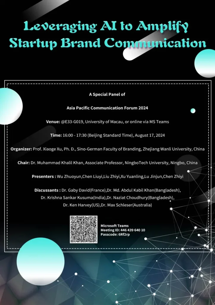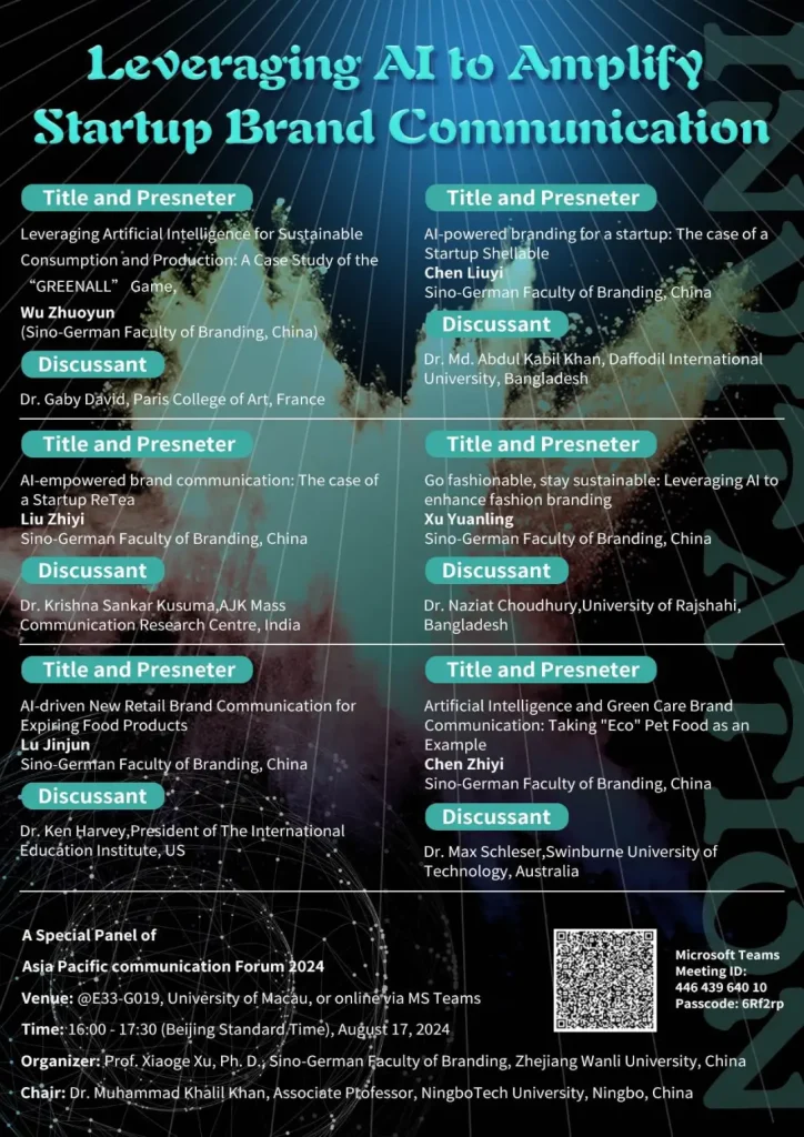 existProf. Xu XiaogeThe guidance from theWu Zhuoyun, Chen Zhiyi, Chen Liuyi, Lu Jinjun, Liu Zhiyi, Xu Yuanling from the 21st grade of Advertising 2+2 major., a total of six students formed a panel to do a panel discussion on the topic of"Leveraging AI to Amplify Startup Brand Communication."The sharing with six experts from the United States, France, India, Australia, and Bangladesh and other online attendees discussed in depth aboutHow startups can use AI tools and strategies to enhance brand communications for sustainability and align with the UN's Sustainable Development Goals (SDGs).Prof. Ken Harvey from USA, Prof. Gaby David from France, Prof. Max Schleser from Australia, Prof. Krishna Sankar Kusuma from India and Prof. Abdul Naziat Choudhury and Prof. Md Adbul Khabil Khan from Bangladesh gave positive comments on the students' papers and advised them respectively. , and gave suggestions respectively.