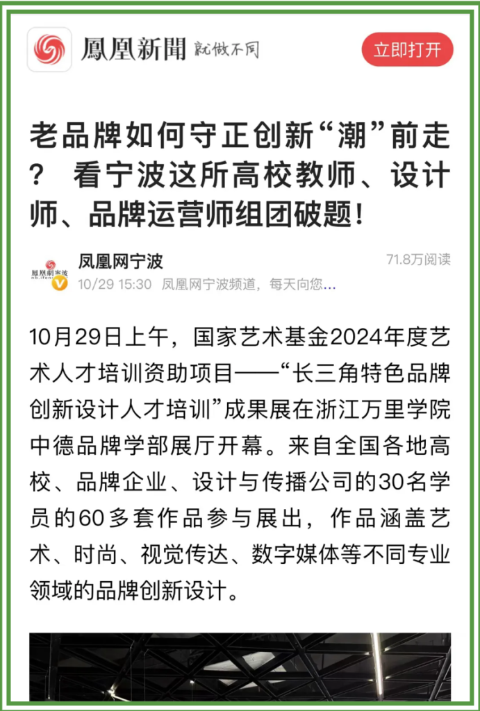 The exhibition isDebut of the Sino-German Brand School Building ShowroomIt is also a concentrated display of the achievements of young brand designers and planners, and a collision of creativity and wisdom, injecting new vitality into the field of brand design in the Yangtze River Delta. Not only has it attracted widespread attention on campus, but also by theChina News, Yongpai, CCTV, Phoenix News, Chao NewsThe media coverage from outside the university and other media outlets allowed a wider audience to appreciate the unique charm of the innovative design of the Yangtze River Delta's distinctive brands.