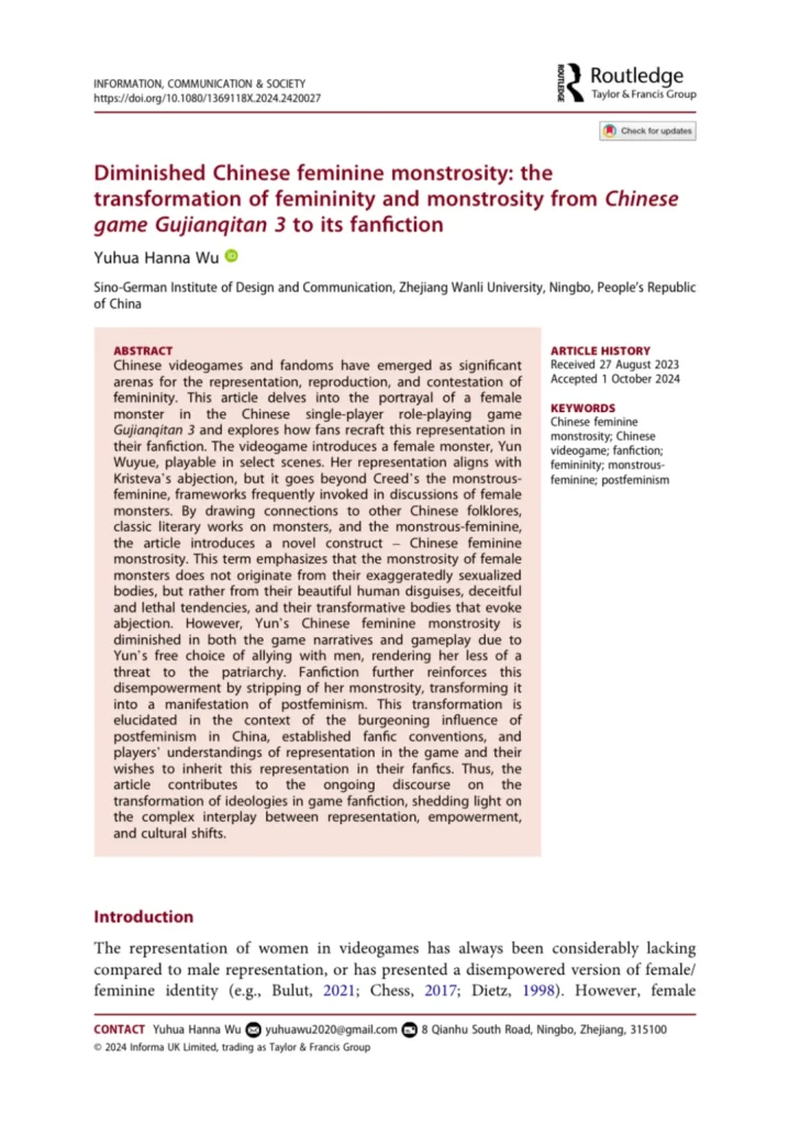 Wu Yuhua's thesis isBasic research on Chinese game culture and fan culture.. Drawing on two fundamental theoretical frameworks in media studies, Abjection and Monstrous-feminine, this paper delves into the portrayal of female monsters in Chinese single-player role-playing games (RPGs) and analyzes how fans have reinvented this image. By innovating in relation to other Chinese folklore, classic monster literature, and the Monstrous-feminine theory, sheIn the paper, a completely new concept is proposed--Chinese feminine monstrosity. at the same time, the paper discusses how fans reshape characterization as well as ideology in games, revealing the complex interplay between representation, empowerment, and cultural transformation.